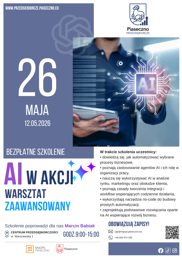 Centrum Przedsiębiorczości w Piasecznie zaprasza na bezpłatne szkolenie „AI w akcji – warsztat zaawansowany”.