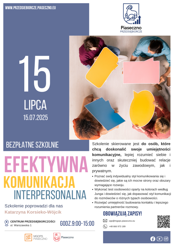 Centrum Przedsiębiorczości w Piasecznie zaprasza na bezpłatne szkolenie „Efektywna komunikacja interpersonalna”.