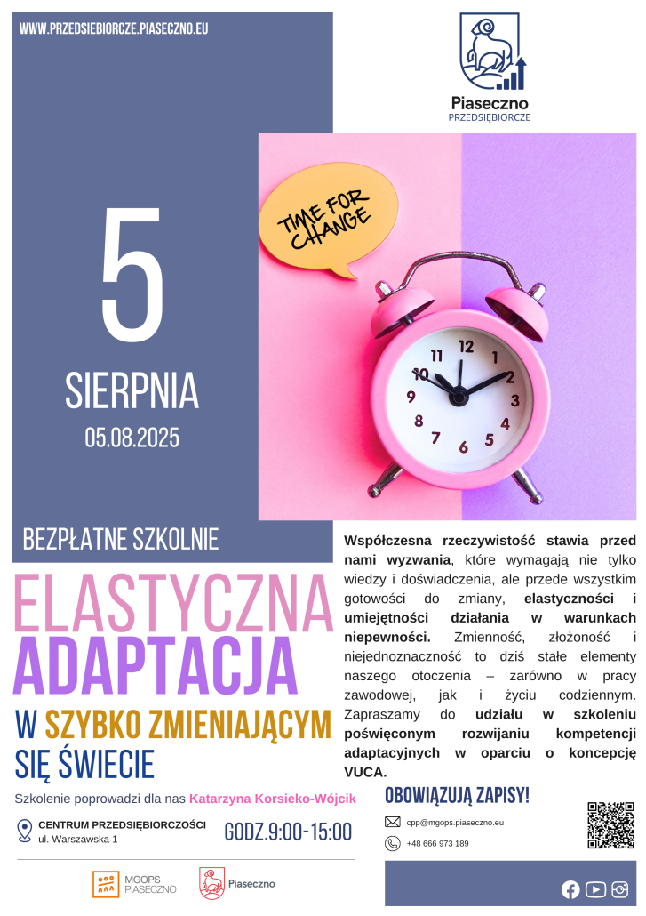 Centrum Przedsiębiorczości w Piasecznie zaprasza na bezpłatne szkolenie „Elastyczna adaptacja w szybko zmieniającym się świecie”.