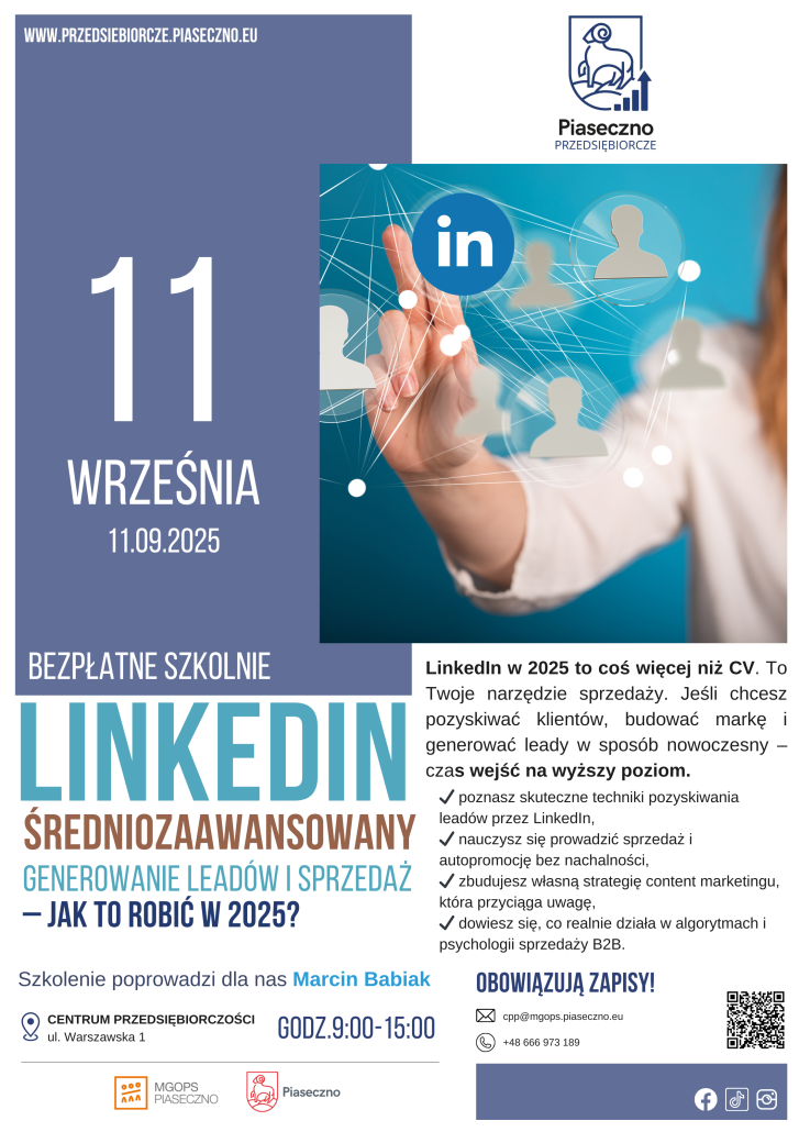 Centrum Przedsiębiorczości w Piasecznie zaprasza na bezpłatne szkolenie LinkedIn średniozaawansowany – generowanie leadów i sprzedaż – jak to robić w 2025 r.”.