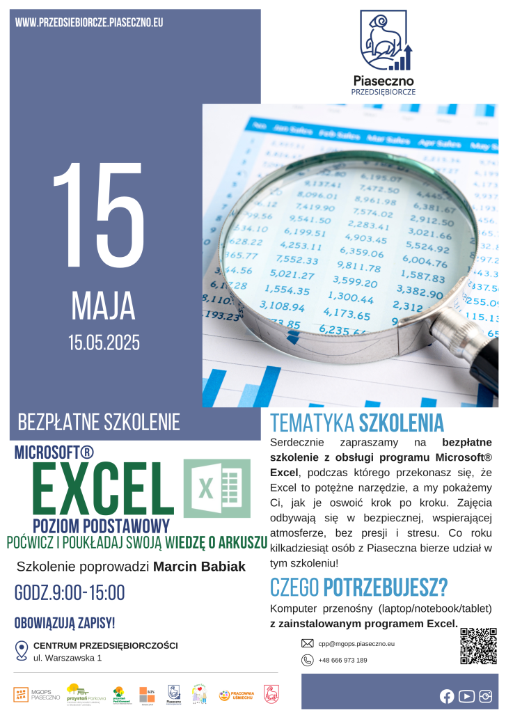 Bezpłatne szkolenie w Centrum Przedsiębiorczości w Piasecznie „Microsoft® Excel – poziom podstawowy. Poćwicz i poukładaj swoją wiedzę o arkuszu”