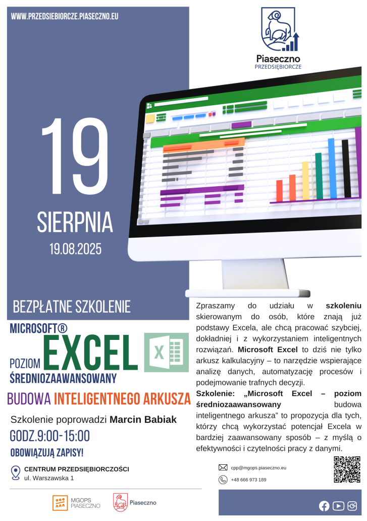 Centrum Przedsiębiorczości w Piasecznie zaprasza na bezpłatne szkolenie „Microsoft Excel – poziom średniozaawansowany – budowa inteligentnego arkusza”.