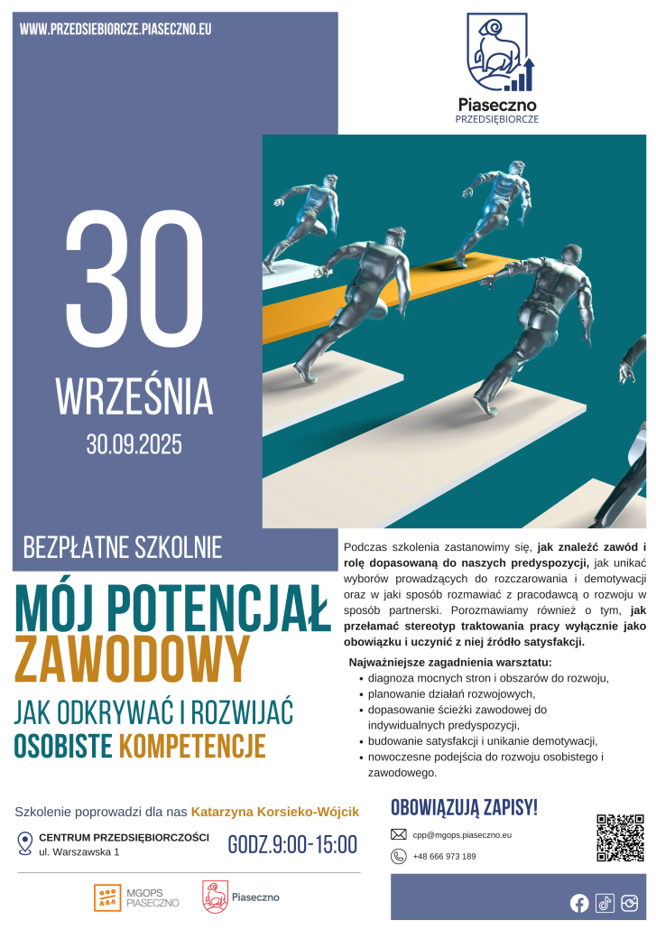 Centrum Przedsiębiorczości w Piasecznie zaprasza na bezpłatne szkolenie „Mój potencjał zawodowy- jak odkrywać i rozwijać osobiste kompetencje”.