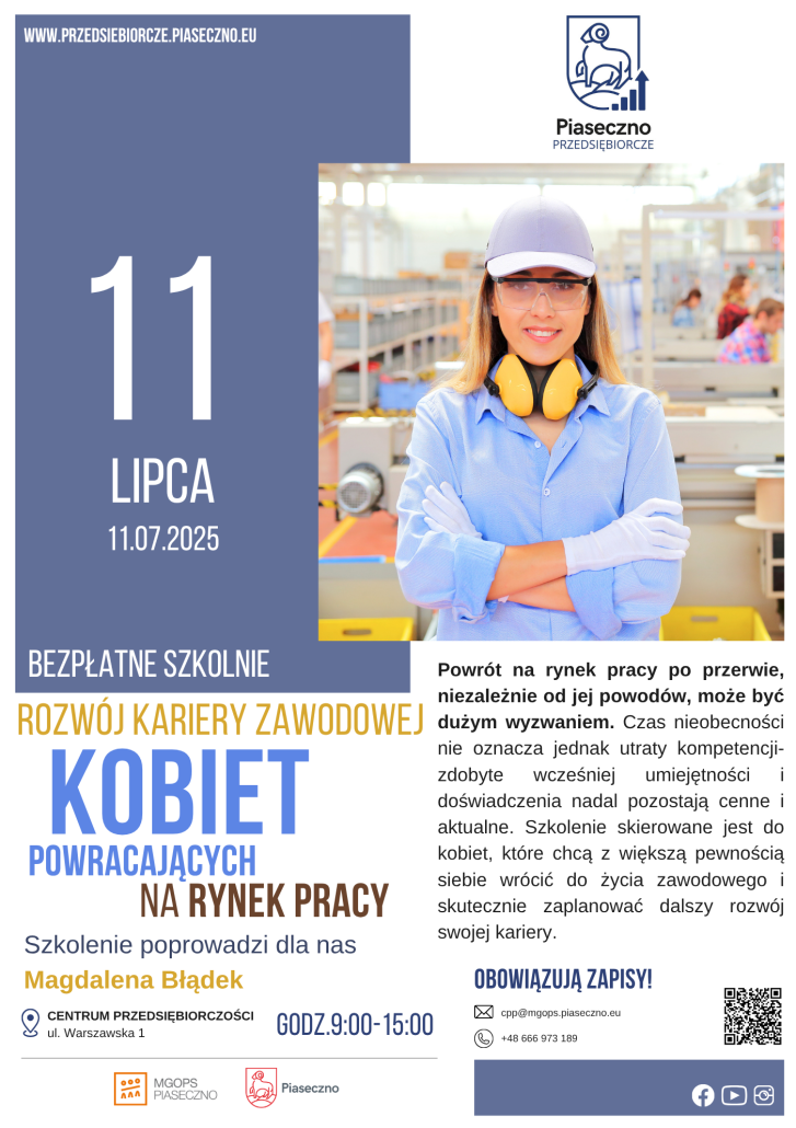 Centrum Przedsiębiorczości w Piasecznie zaprasza na bezpłatne szkolenie „Rozwój kariery zawodowej kobiet powracających na rynek pracy”.