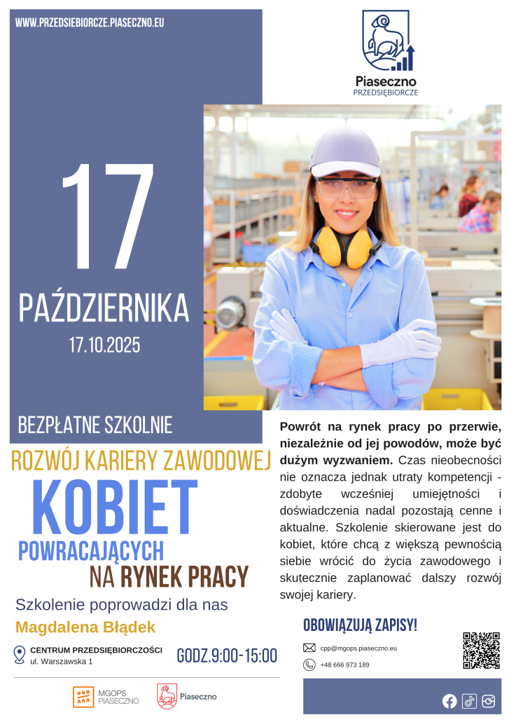 Centrum Przedsiębiorczości w Piasecznie zaprasza na bezpłatne szkolenie „Rozwój kariery zawodowej kobiet powracających na rynek pracy”.