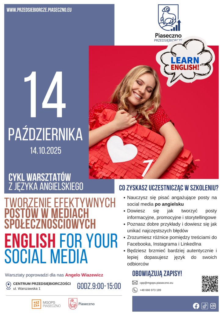 Bezpłatny warsztat językowy w Centrum Przedsiębiorczości w Piasecznie „English for your social media- tworzenie efektywnych postów w mediach społecznościowych”