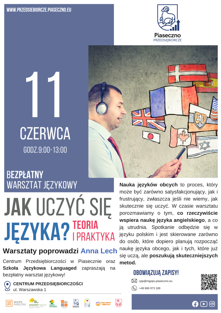 Centrum Przedsiębiorczości w Piasecznie oraz Szkoła Językowa Languaged zapraszają na bezpłatny warsztat językowy „Jak uczyć się języka. Teoria i praktyka”.