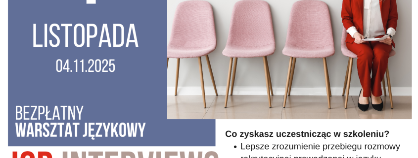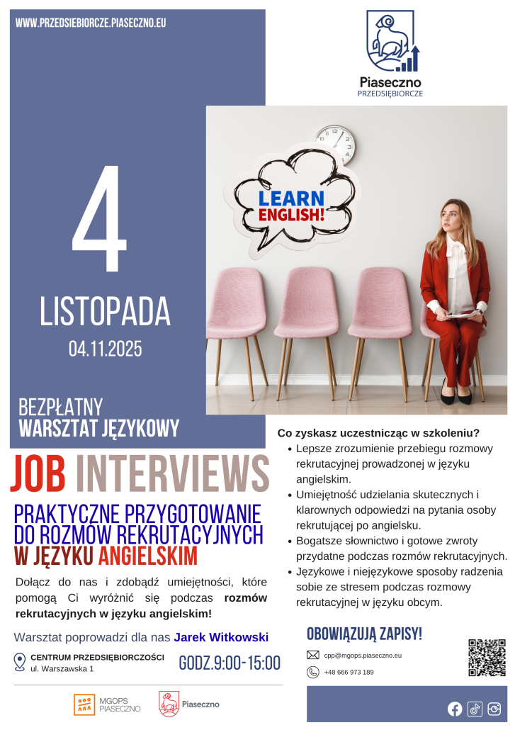 Centrum Przedsiębiorczości w Piasecznie zaprasza na bezpłatny warsztat językowy „Job interviews – praktyczne przygotowanie do rozmów rekrutacyjnych w języku angielskim„.