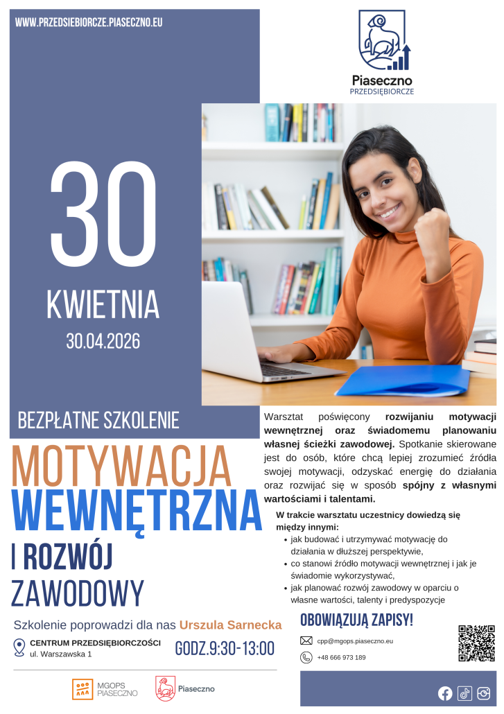 Centrum Przedsiębiorczości w Piasecznie zaprasza na bezpłatny warsztat „Motywacja wewnętrzna i rozwój zawodowy”.