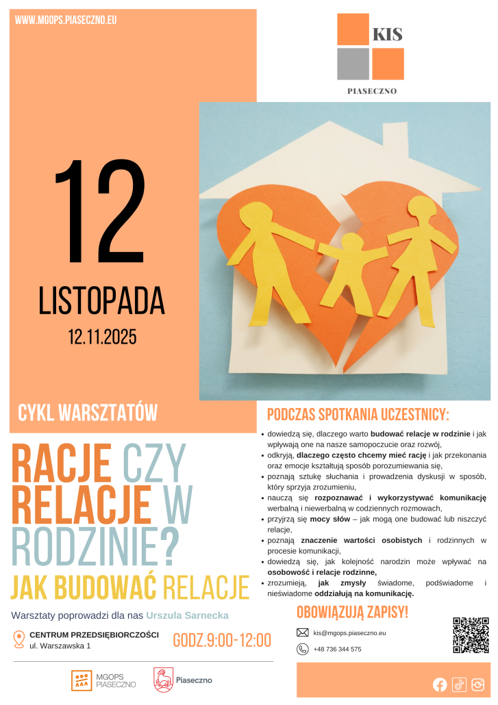 Warsztat będzie okazją do refleksji nad tym, co ważniejsze – racje czy relacje – oraz do zdobycia praktycznych narzędzi wspierających budowanie bliskości, porozumienia i harmonii w codziennym życiu rodzinnym.
