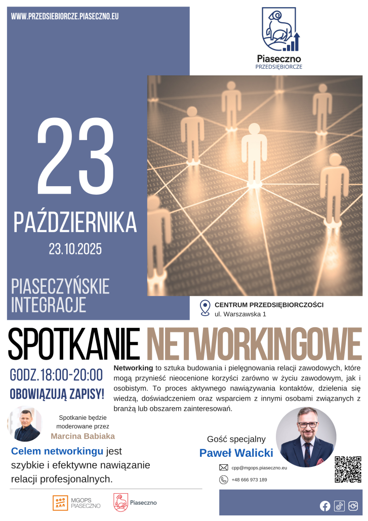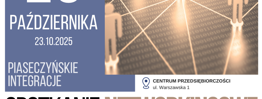 na spotkanie networkingowe z cyklu „Piaseczyńskie integracje”, które odbędzie się w czwartek, 23 października 2025 r. w godz. 18.00-20.00.
