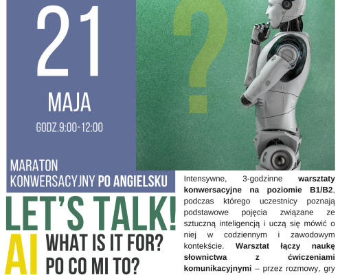 Bezpłatny warsztat językowy w Centrum Przedsiębiorczości w Piasecznie "Let’s talk!, czyli maraton konwersacyjny po angielsku. AI - what is it for? / AI - po co mi to?"